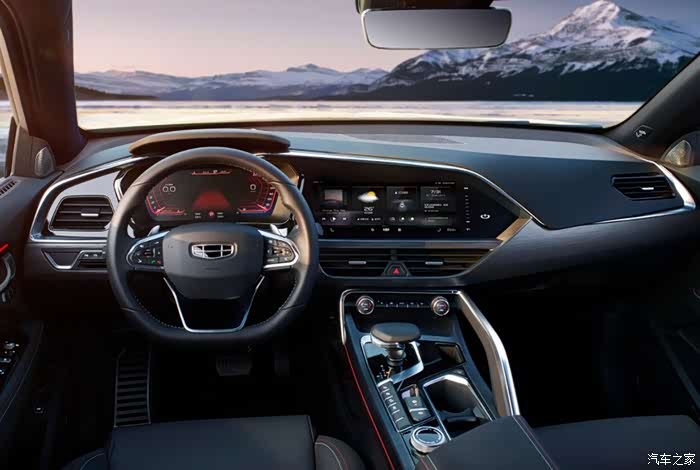 吉利星越中控台采用飞翼式设计,嵌入式的大尺寸中控屏略微向驾驶席倾斜,