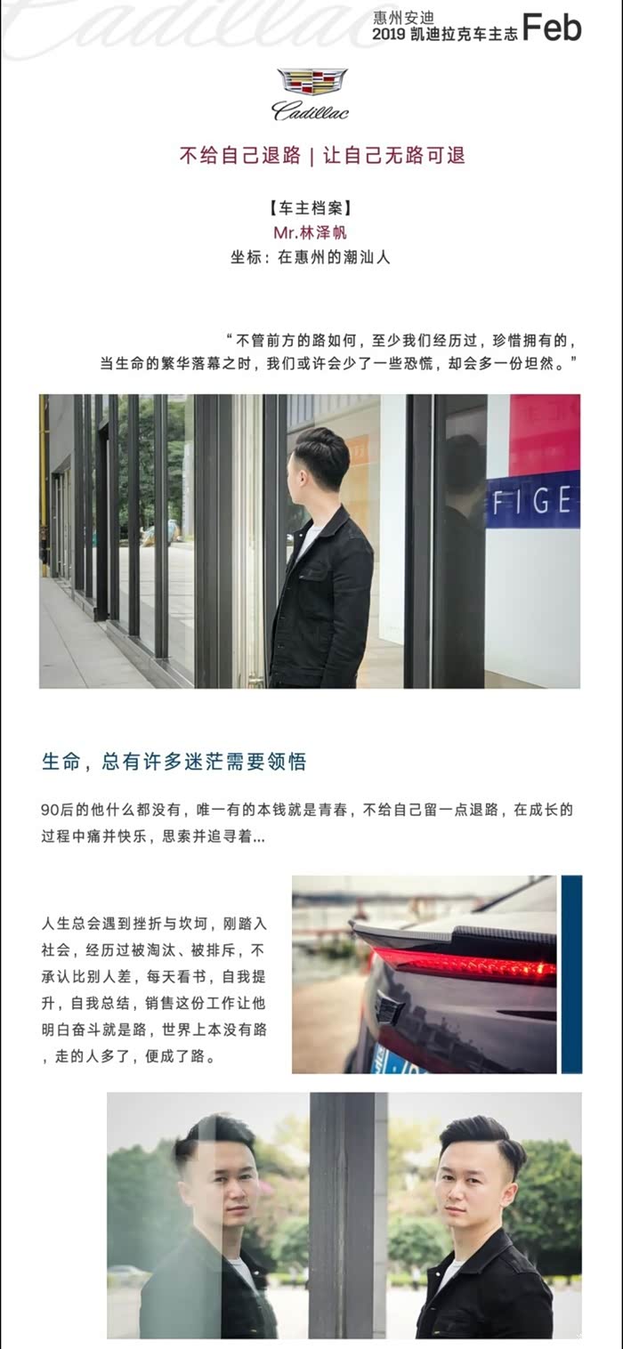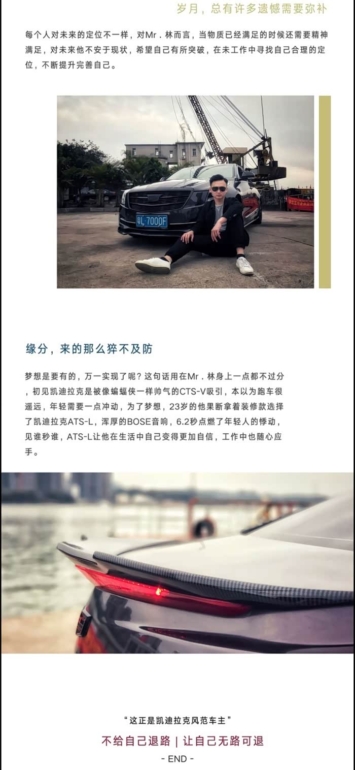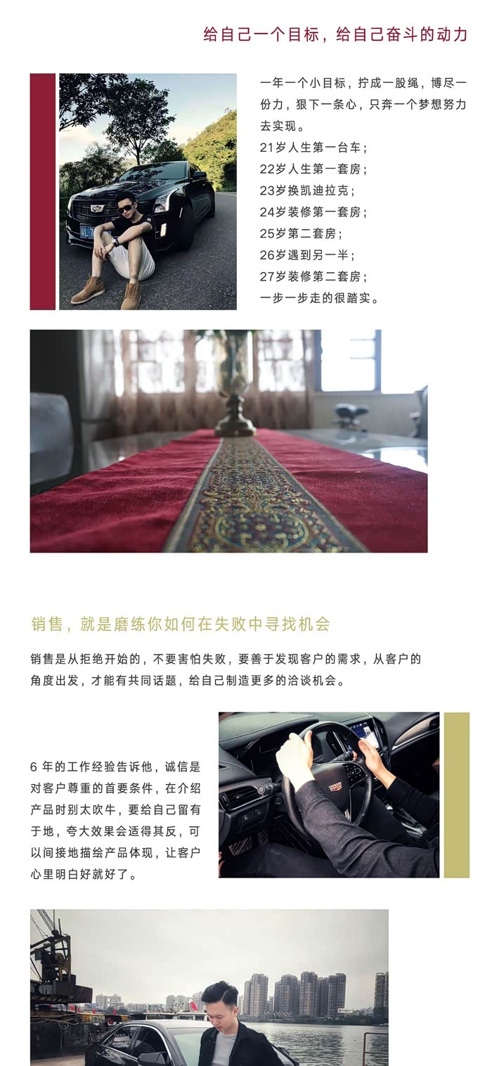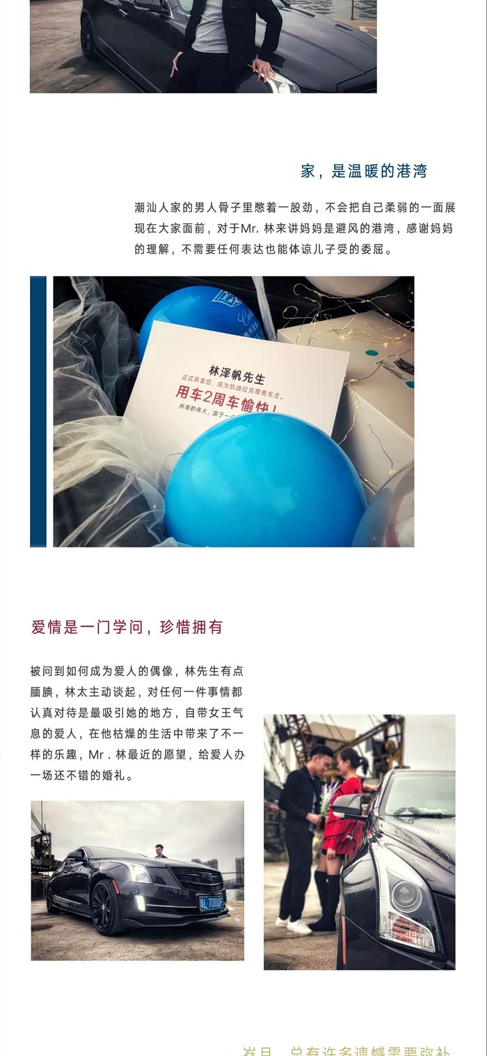 凯迪拉克在美系里边的市场营销做得真的很好,乃至整个汽车界里边都排名靠前的,每个新车从上市,请代言人,到推广,都是很符合当下年轻人讲究的品味。虽然品牌溢价已经大不如以前了,但情怀格调这一块,还是很抓年轻人的心的。特别让我感动的一点,他们市场部经常都会上门感恩回馈老客户,每一个车主,都会有一段辛酸的奋斗史嘛,哈哈,只要你愿意,他们都很乐意带点小礼物,跟你约时间,上门采访你,拍精美照片,再帮你做个特辑,让你做回“名人”感觉,在销售课程里“感动一刻”这细节,真的做得太好了,这里放下他们精心为我们两公婆的特辑哈。花费了一下午,享受了以前从未享受过的待遇。。