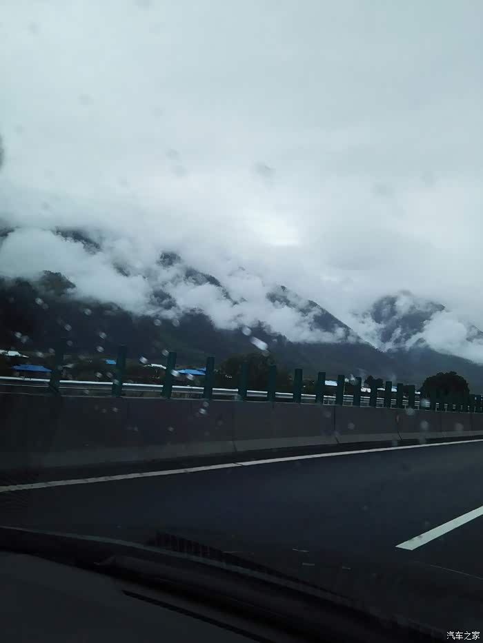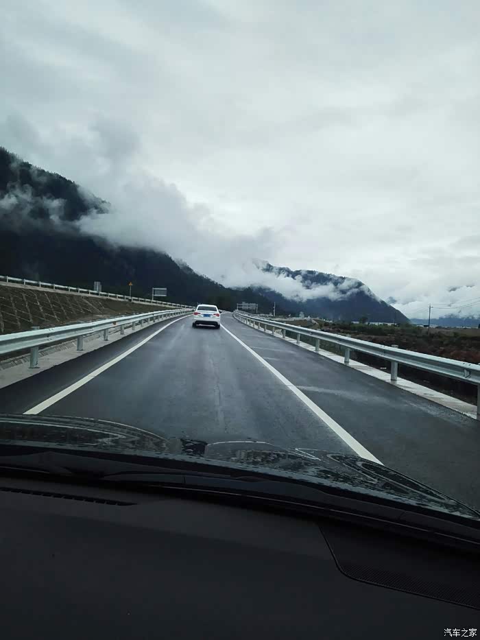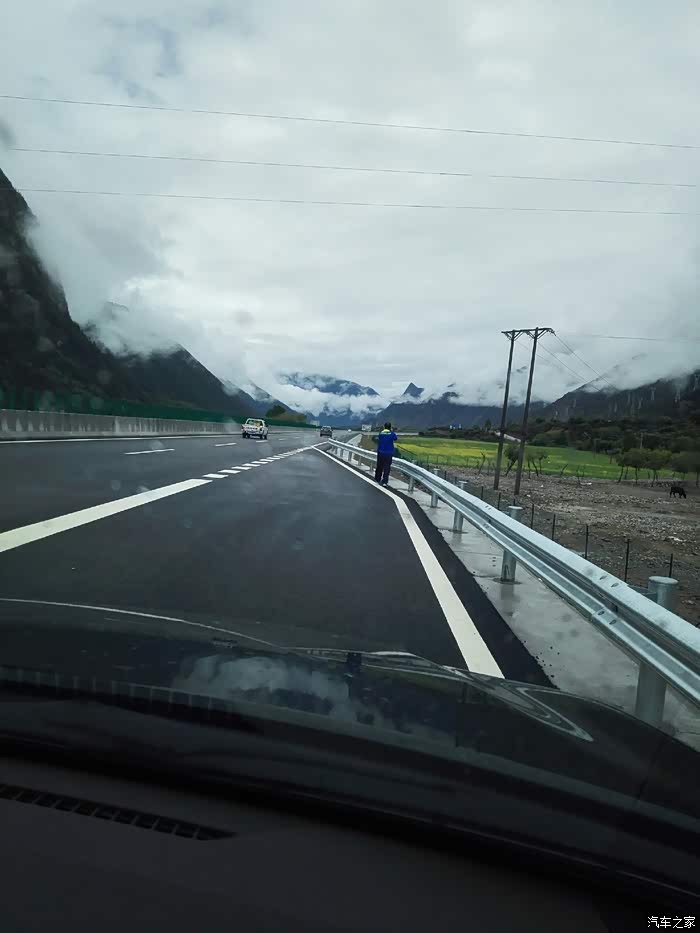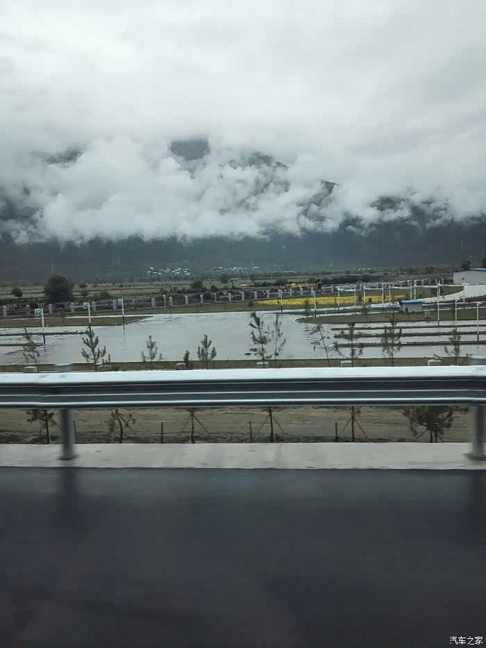 林芝至工布江达镇(路程120公里)可行驶林拉公路,和我们的高速公路差不多,只是它没有应急车道,车速限速80公里,不收费。以为走专用车道没有风景可看,错了。因为下着雨,那些山那些云,云山雾罩,虚无缥缈,如梦如幻。路边的田园风光,开得黄灿烂的油菜花让景色锦上添花。