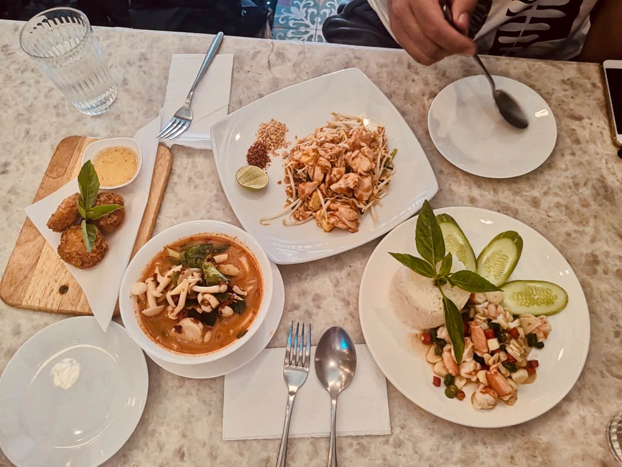 跟着导航走很快就能到,店里位置不大,但是布置比较干净,就8个餐桌,尽量别饭点去,否则要排队等好久(别问我怎么知道的)。每道菜味道都不错,大虾冬阴功汤很浓郁,酸酸辣辣很开胃,很好吃。虾饼也不错,泰式炒河粉真是我的最爱,整体性价比非常高,我们两人吃了不到?500,榜单里面算便宜的了。这家店一般早上10:30才营业,到下午16:45就关门了,周六全天休息,周日营业。