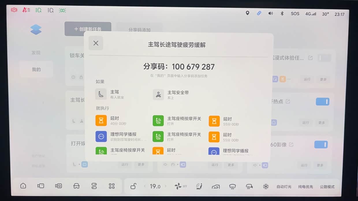建议和技巧:座椅按摩和语音提醒都可以设定好任务大师,行车多长时间就可以自动开启座椅按摩,行车多长时间让理想同学跟你互动,设定好任务大师后,车机就会按照 条件自动运行,可以说非常方便和智能,不会因为自己忘记而忘记,理想的任务大师真的可以点赞,太多功能可以实现任务大师的设定和自动操作,用了真心好。理想的车友有需要可以参考下列的分享码自己添加哈。