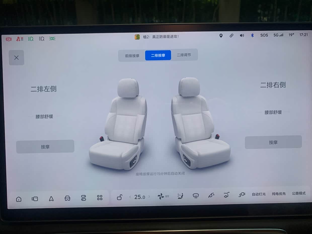 疲劳了可以开启座椅按摩,第一排和第二排都有按摩功能,也可以设定任务大师自动开启和关闭