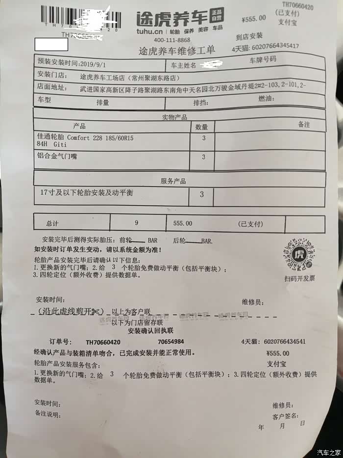 轮胎是在途虎养车天猫旗舰店买的,价格很划算,比线下划算很多。还有不得不说途虎养车很专业,服务态度好不说,技术以及最后质检流程都很好。