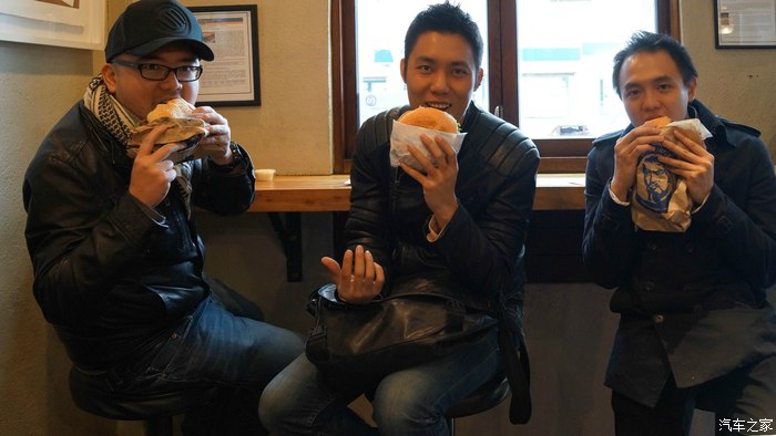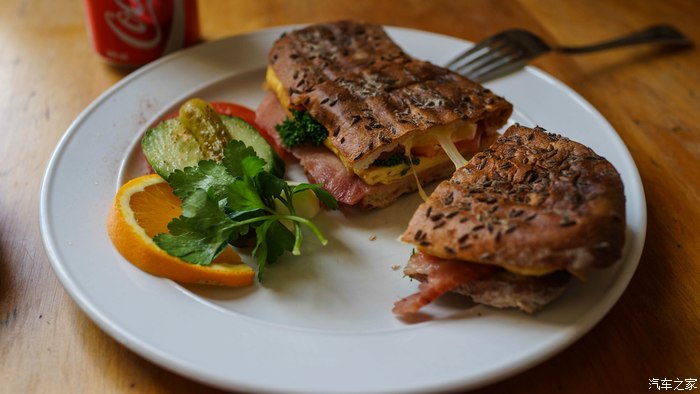 在我欣赏调羹的时候我点的美食已经来到了面前。培根芝士三明治的量对于亚洲人来说已经足够果腹。