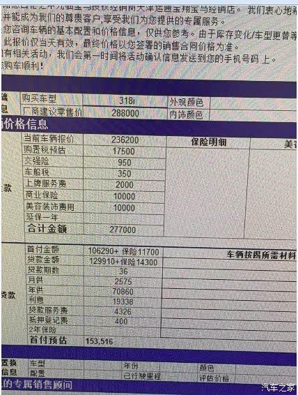 首先,楼主今年26,目前是天津一家国企职员,老家浙江,本次买车家里赞助一部分,自己攒了一部分(刚毕业三年),所以贷款买车。之前首辆车是前个单位的老版桑塔纳和捷达,所以对大众的印象不错。后来家里买了一辆车,1.6Lcross Polo,红色(无力吐槽,老妈的选择),基本上是老妈在家里开,16年国庆开回天津过完年开回去了,这里不得不吐槽天津的摇号。年前外地车辆确实不方便,所以决定拍号在天津买车,最开始的考虑是老款途观,想买四驱视野版,SSSS店询价估计27万多点(加牌照小3万),当时因为是1.8T的不着急在年前买,所以暂时没买。1月18号吧,途观L出了,价钱太贵,而且泥煤的全部加价,老款的途观没货(逼着买新款),顿时对大众没兴趣了。在汽车之家看了看,最开始想买宝马2系旅行车,后来对两厢的确实无感,所以加了点准备买318i。看车买车一路坎坷,最后跟SSSS店经理直接谈价,裸车236200,三年保险(首年1万,后两年8折,可以进月供),QJ装具1万(贴膜镀金倒车行车记录仪各种垫),2000上牌,杂七杂八下来277000,跟经理要了3次保养。现在由于没指标,得下月拍,车这月到,估摸得4月提车,大家看看价格合适吗(牌照估摸3万内搞定,没预算上320LI了,遗憾。)