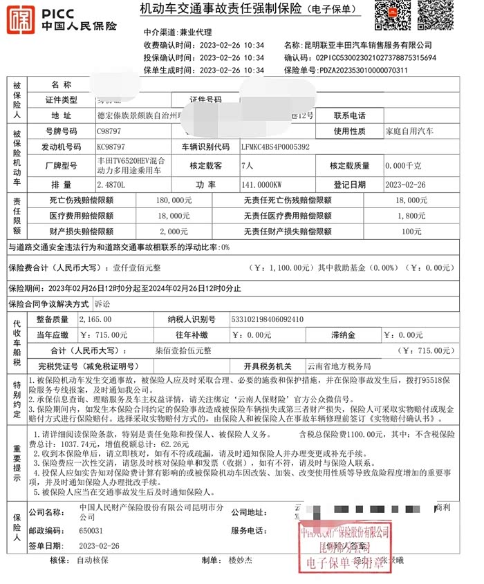 新车,保险直接在店里牛出了,因为要从昆明运来给我,所以出店前就上了税肯定更保险。就是保险有点高,总的算下来达到了8000元,虽然新车是贵了些,但是也贵的有点多了。又是肉疼。车辆我只是远程要求店里检查好,不然交到我的手上的时候,如果有啥问题,就麻烦多了。运送车直接送到家里给我,购车离店出发仪式也没有了
