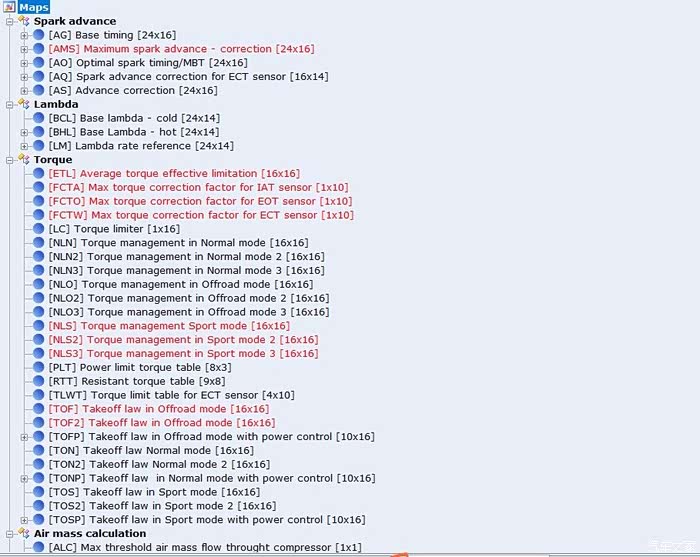 对于日益复杂的车辆,发动机扭矩管理占据了重头,涉及的因素相当多,包括总扭矩限制,进气、油温、水温对扭矩的管理,DNA模式、ESP介入时、各种扭矩管理等等。轮胎打滑esp介入时,也有相应的扭矩限制来限制我们的车身动态来防止失控,这也是原厂程序顿挫感来源重要因素之一。那么我们在提升动力的时候,对于扭矩管理的调整占了很大一部分,在合理范围内适当放宽限制,让车在各种工况下输出更加平滑,甚至可以实现不关闭esp完成一定限度内甩尾侧滑之类的动作。当然,合理的限制扭矩,是对驾驶安全的基本保障。这里吐槽下,因为280的马力更大一些,部分扭矩管理甚至比200来的更加严格,比如油气水,高温限制扭力更多。