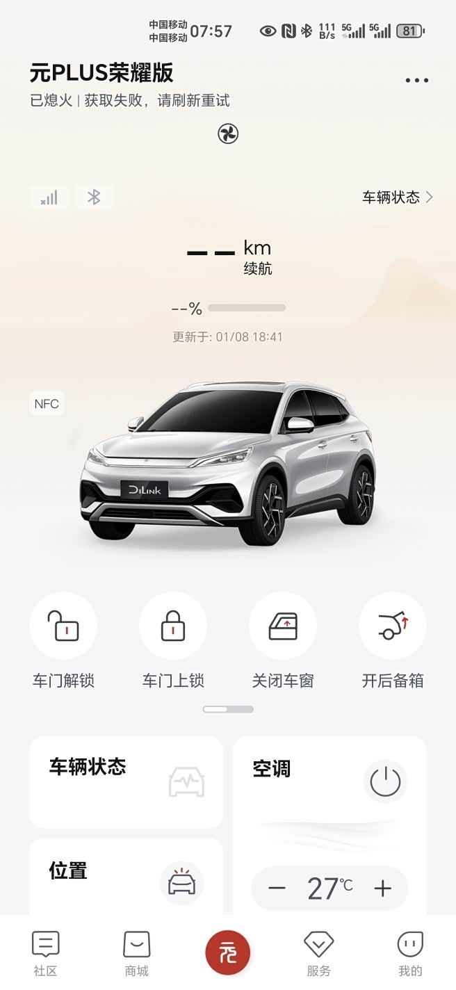 一直刷新显示无法连接,无法操作开锁,关锁等基本功能,一度还退出到购车界面