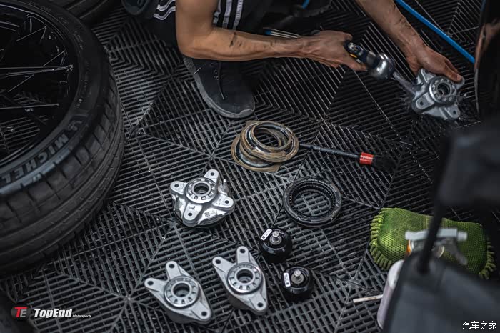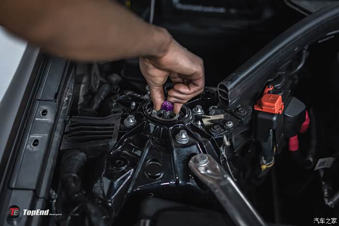 KWV3避震器基本都是不带塔顶的,这里要拆下原车的塔顶继续沿用要KWV3避震器上,拆避震器螺丝切记不要用风炮拆,避震器桶芯高速转动会导致避震器损坏