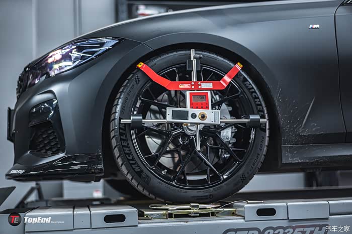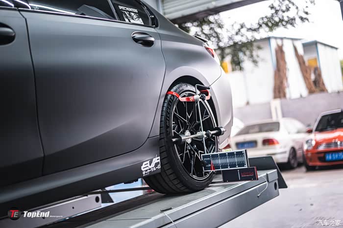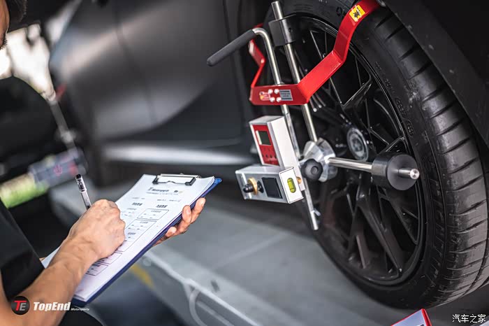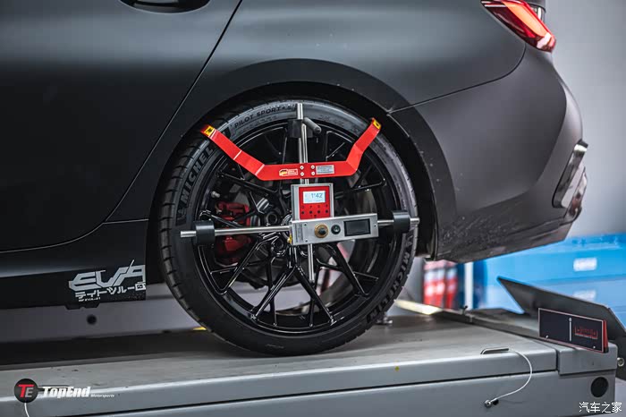 首先在开始拆避震器前,我们会先平衡4个车轮的胎压,然后测量并且记录原车数据,包括车身高度,前后束角,前后倾角。因为经常有很多车友问我为什么升级了绞牙避震器明明两边调整到了一样的高度但是实际落地后左右高度还是有偏差。实际上原车高度很多时候都不是一样的,这里做这个记录也能保留一些原厂的数据,也可以做一个前后的对比。