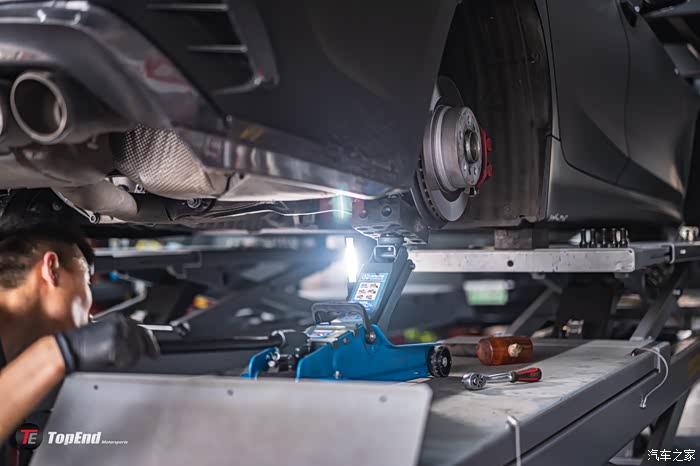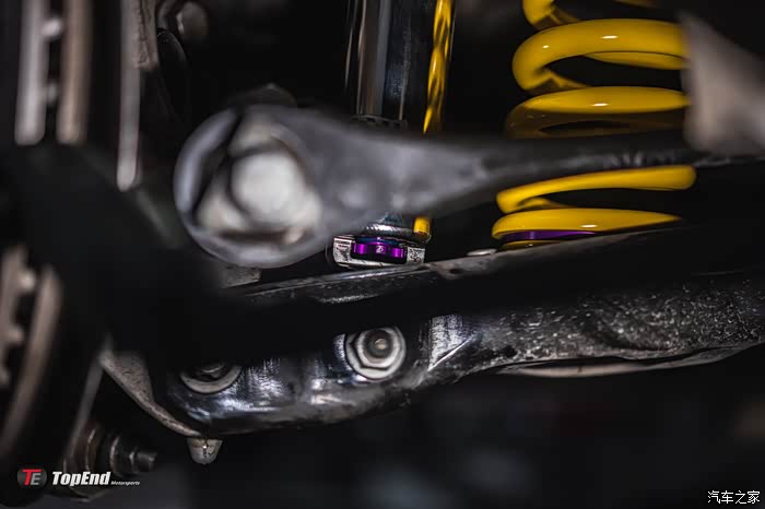 衬套复位的原理也不复杂,原厂的衬套在车辆的平整状态时,地盘上得所有衬套一定是在最佳位置(最松弛的状态),在降低车身后所有的连杆和支臂上都会有变化,所以这个时候让车辆悬挂部件保持在平地上的位置,在把衬套位置的螺丝松开让衬套自动复位(原厂基本是实心的橡胶衬套),然后再紧固螺丝就完成了。(改装的一些衬套类似鱼眼的强化衬套可以忽略这个项目)