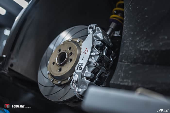 可以看到升级了一套很不错的刹车:AP RACING CP9562 六活塞卡钳搭配国产碟盘380mm,19寸轮毂刚刚合适,这个卡钳用小活塞版本是最适合这个车型的