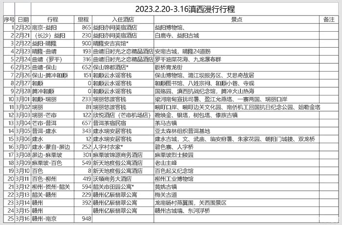 行程:南京-益阳-晴隆-曲靖-保山-腾冲-瑞丽-芒市-普洱-建水-屏边-百色-柳州-韶关-赣州-南京;