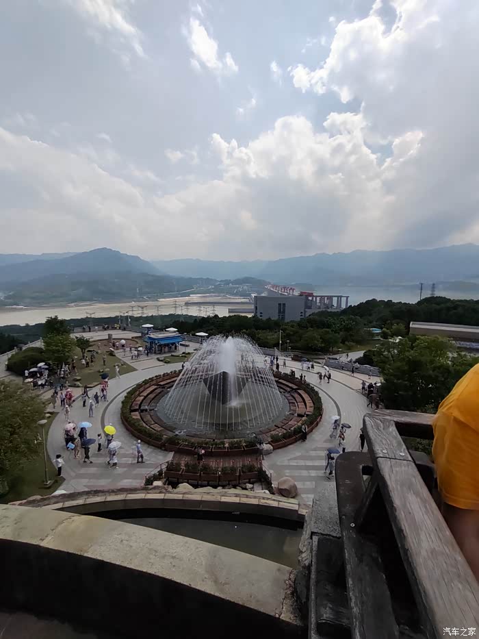又跑到游览完三峡大坝从景区出来了,远处山上有个瀑布,山顶仙雾缭绕,很是迷人
