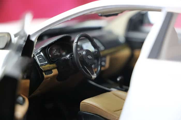 模型比例1:18,官方给出的漆面颜色为珍珠白,在黑色倒影桌拍摄可以拍出车模的气势,这组色调偏暗,拍车模的场景要细心去观察,去发现,说不定一块好地方就是拍车模的圣地呢,这次拍摄一共用到了车模,两盏台灯,单反相机,其实想用三脚架来着了,但是三脚架目前没在我这里,所以干脆持手拍摄,车模的价格直到目前还很优惠,我拍的是我参加活动得的奖品,没有花钱,我不明白为什么车模的后视镜不能折叠,不知道真车就是这样设计的,还是车模没有做出来,一辆的好的车模,就要看它扎实的做工,和各种细节的还原程度,车模仿的的原车高配,全黑车顶的设计彰显运动,和我原来有个GS4车模是相同的设计,现在的汽车这样的设计越来越多,可能是追溯潮流的原因吧。打开车门欣赏内饰,内饰以棕色和黑色为主,车的中控台摁键清晰明了,就连车载导航也把导航中的路线清晰做了出来,内饰细节可圈可点,内饰车门拉手镀铬件,原车的内饰和车模的内饰相似度百分之90,前引擎盖和后备箱开关均为狗腿,看着真是不美观,但是这是无法避免的,几乎所有的国产原厂模型这两个部位都是用的狗腿,但也比某些品牌要略好,起码我们原厂模型车门是合页,不是狗腿。