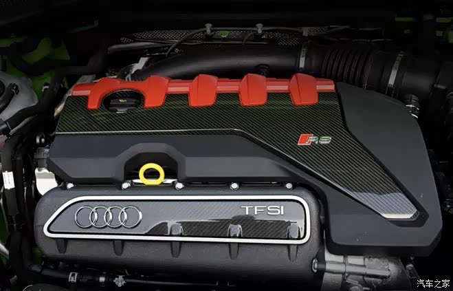 RS3搭载了2.5升5缸涡轮增压发动机,此款发动机是目前世界上唯一一台搭载在市售量产车的五缸发动机。在知乎上看到博主较为详细的说明了此款发动机,“此款发动机的罩盖是我见过包装最豪华的直列发动机罩盖之一,两处用了碳纤维底板,同时装饰的拆件做的非常细致,多处用了镀铬和喷漆装饰。