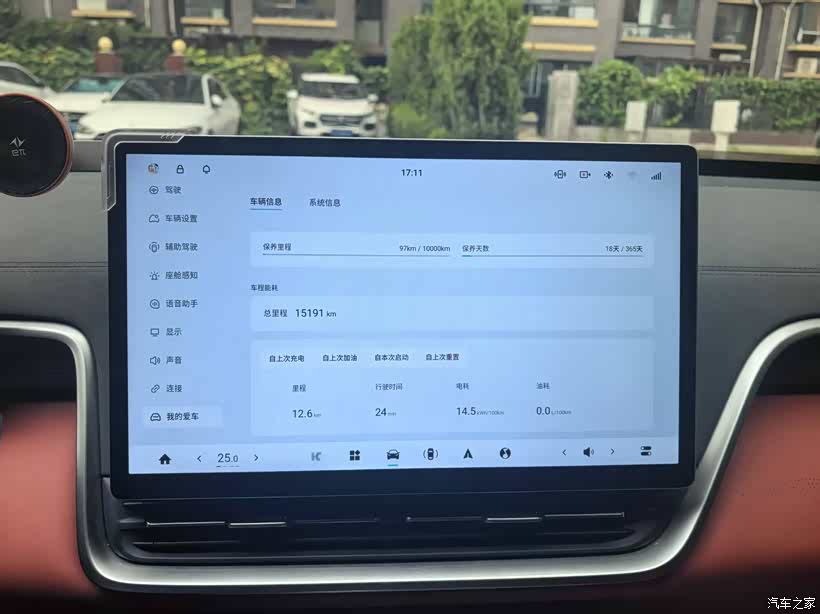 我的车型是2024款eπ008增程210Max版6座,2024年7月提车,到保养时刚好一年半,总里程跑到了15200公里,正好达到15000公里的二保节点。作为家用主力车,它的使用场景特别固定,平时主要是我上下班通勤和接送俩娃上下学,市区开基本依赖纯电模式,满电表显续航202公里,春秋季天气适宜时实际能跑180多公里,我每天通勤,一周充一次电就足够;只有周末带全家周边游或者小长假长途自驾时才会用到燃油模式,去年去威海、青州、徐州等地自驾游,全程用油,百公里油耗大概6.5-8.5L,加92号汽油,算下来长途一公里成本才5毛多,性价比很高。这次保养除了完成常规项目,还想解决两个小问题:冷车开门时香氛机的“咔哒咔哒”异响,以及二排扶手偶尔出现的松动异响,这两个小毛病虽然不影响驾驶,但总让人心里不舒服。