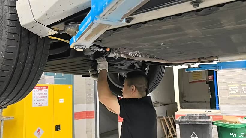 车辆进入工位后,师傅首先将车辆举升起来,准备更换机油和机油滤清器。随着油底壳螺丝被拧开,深黑色的旧机油缓缓流出,师傅说虽然我不怎么用增程器,但是机油是有自然寿命的,时间久了也会变质,再继续使用可能会影响增程器寿命。在放机油的同时,师傅仔细检查了底盘,确认没有磕碰痕迹和破损,还逐一查看了悬挂系统和刹车管路,确保没有松动和渗漏情况。
