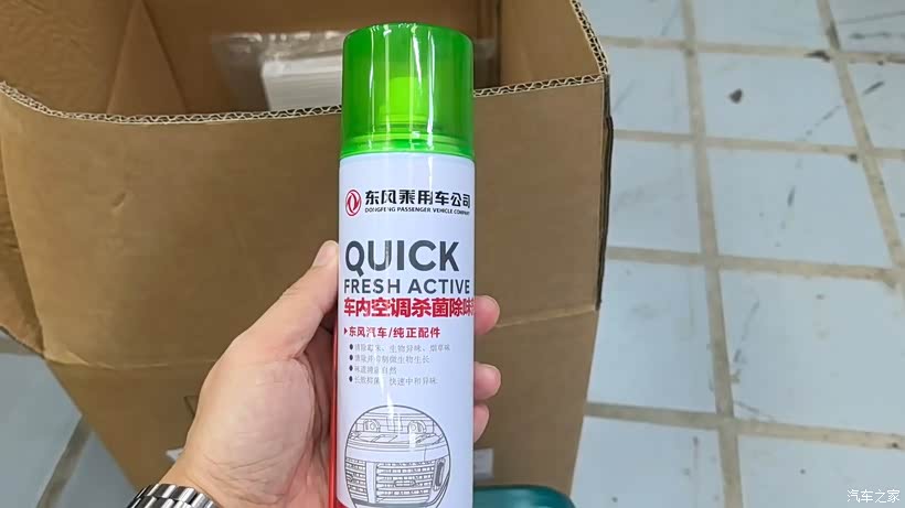 机油机滤更换完成后,师傅开始进行空调系统养护。他拆开副驾位置的面板,取出旧的空调滤芯,安装好新滤芯后,拿出东风专用的空调除味剂,均匀喷洒在空调风道和各个出风口,随后启动车辆,将空调调至内循环模式,让除味剂充分循环,彻底清除风道内的细菌和异味,处理完后打开空调,吹出的风明显清新了不少。