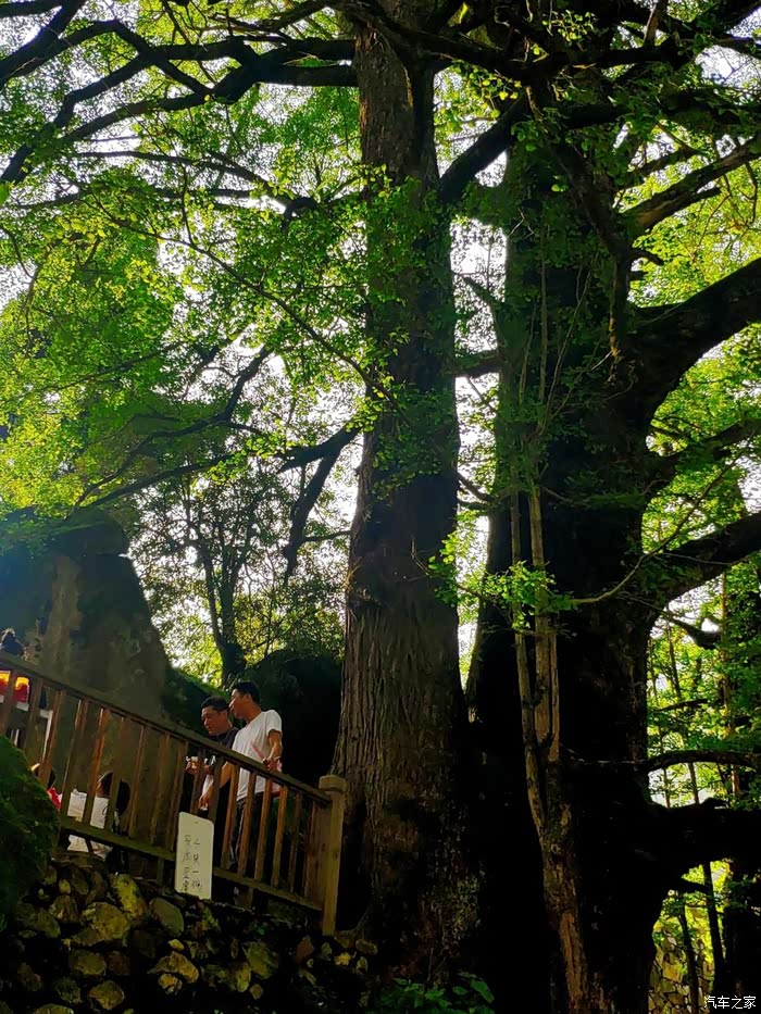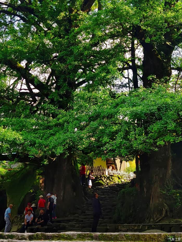 两株巨大的银杏拔地而起,形成一个天然的门洞。银杏已经有1500年高龄,依旧枝繁叶茂,撒下浓浓的绿荫。待到深秋,这里必定是一片灿烂的金黄。