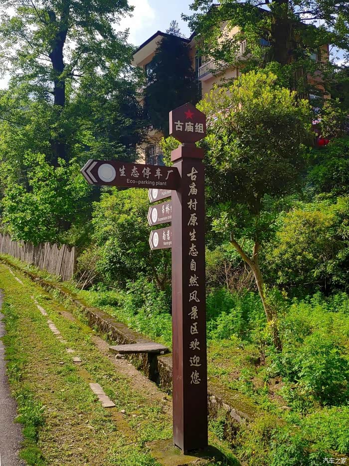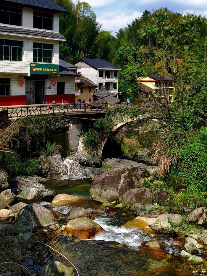 约5公里路到古庙村,停车休息。村子不大,村口有石拱桥,清澈的河水欢快流过,旁边设有长廊、广场、停车场和干净的公共厕所,也令人眼前一亮。