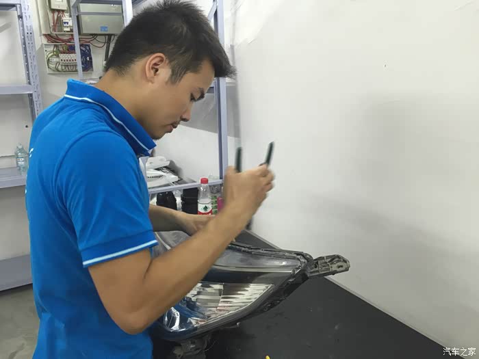 左边大灯进水,师傅在清洗大灯面罩。