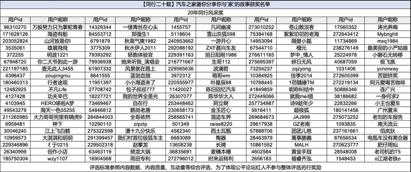 因参与活动内容量巨大,6月17日优先公布“20年时光挚友奖”,共20名,获得200元现金奖励+CEO签名奖牌(现金发放至汽车之家钱包,签名奖牌后续会单独收集邮寄地址)。获奖信息公布后可在6.23日前私信楼主进行举报,查证后取消获奖资格;具体获奖名单如下,评选标准参照视频时长、内容质量、互动量等综合评选。20年暖心陪伴奖7月1日前公布。
