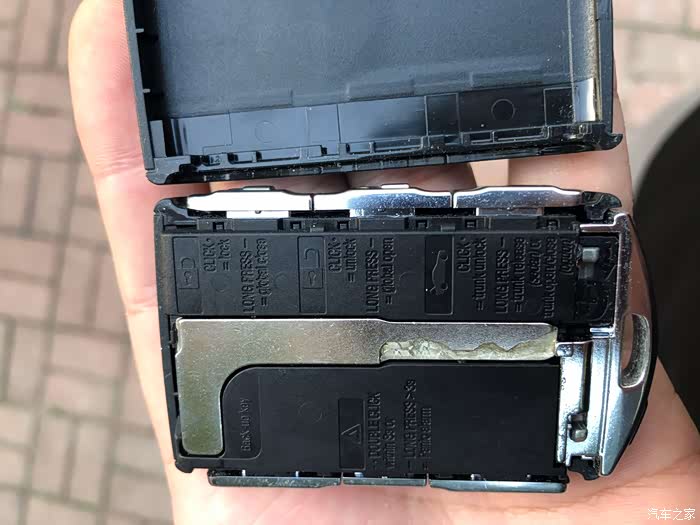 锁扣上有个拨钮,拨动后能把后盖打开,机械钥匙出现