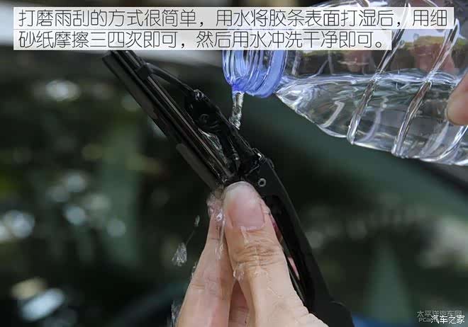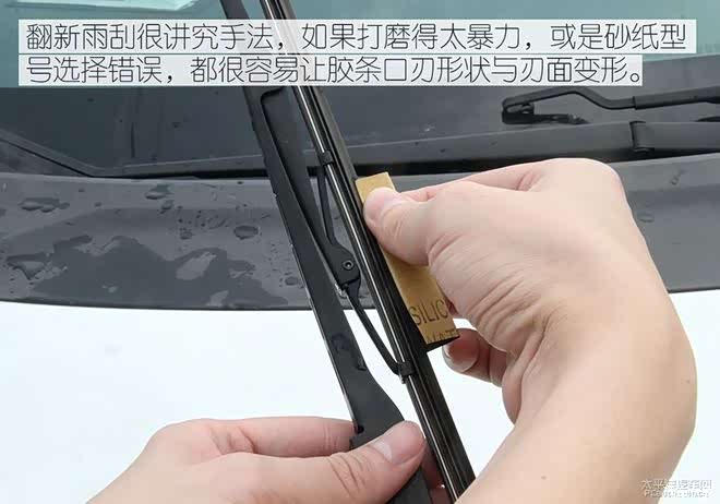 翻新的步骤很简单,先将雨刮器取下清洗干净,再将细砂纸对折后夹住橡胶条,然后用水将胶条表面打湿后,用细砂纸由上自下尽量轻柔地摩擦三四次即可,最后再将打磨下来的颗粒冲洗干净,安装回雨刮臂上即可。