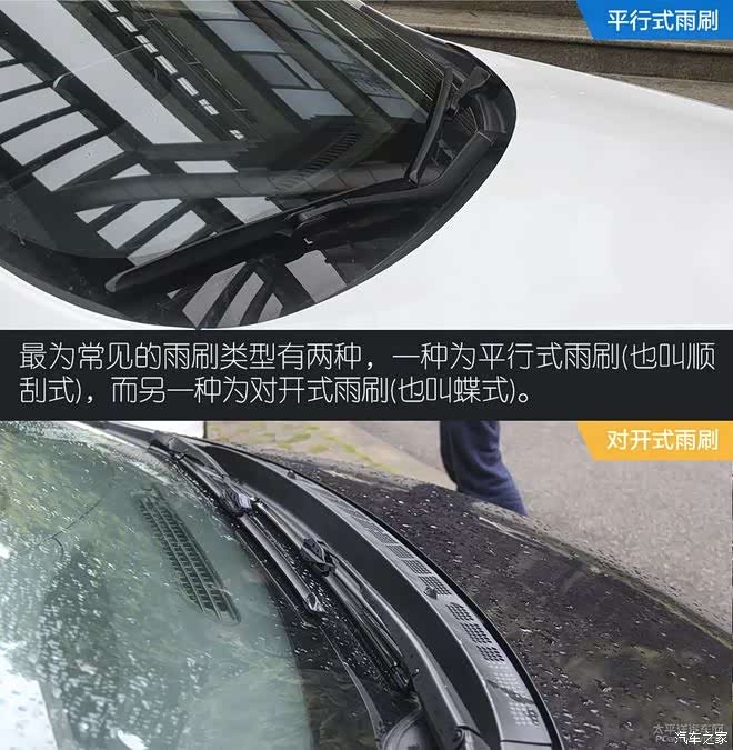 我们最为常见的雨刷类型有两种,一种为平行式雨刷(即左右同步刮刷的方式),而另一种为对开式雨刷(即左右交叉刮刷的方式),如下图。