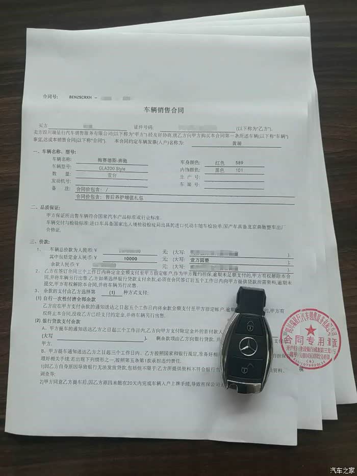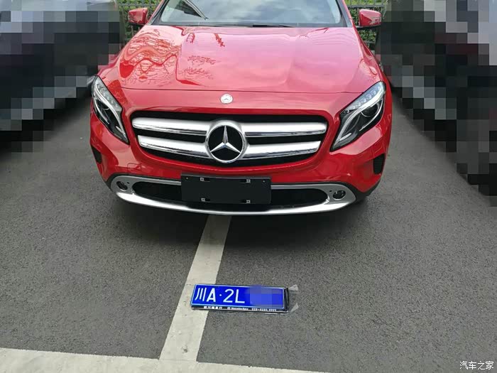之前看很多地方的车友说,车子很翘,很多地方没有现车,我也担心这个问题,果断抓了一个销售顾问来咨询,得到的答案是有现车,并且还有优惠,而且可选的颜色也很多,跟着销售的脚步来到展厅旁边的停车场,一台红色的展车亮瞎了我的钛合金眼,于是乎,今天就办它的想法油然而生。连忙问销售这是什么型号,得到的答案是GLA 200动感型,难道这就是传说中的“天时地利人和”? 还等啥啊,赶紧跟销售谈优惠了,经过N回合大战,本来都冲动的想下单,但是理智最终战胜了冲动,买车毕竟不是件小事儿,还是再看看其他家4S店的情况再说。当天下午,我们顶着烈日又陆续看了2、3家店,真是把朕累得要死,晚上回到家就跟LD商量结果,感觉后面看的几家,要么是颜色不如意,要不就是优惠不到位,离家还很远,所以,最终LD还是决定就在武侯立交附近那家4S店订车,毕竟在这儿买车,混熟点以后爱车有个头疼脑热的保养保修什么的也方便些。