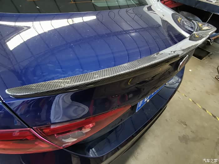 买回来以后就改了两次,第一次装了碳纤维前铲,尾翼,改了豪运版尾唇,黑色尾嘴,碳纤维V字,镀铬饰条贴黑。还有贴了个车衣。