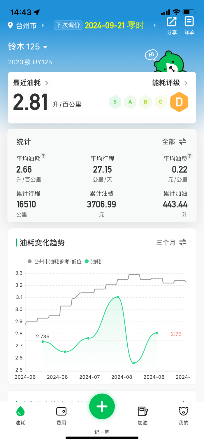 每次到最后一格或者两格去加油,可以自豪的喊一句95加满,这次跑了204公里,加了25.56元。