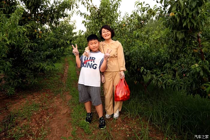 太阳下山了 没那么热了,一起去摘桃子,摘到袋子里的都是自己的,嗯,很甜哦!