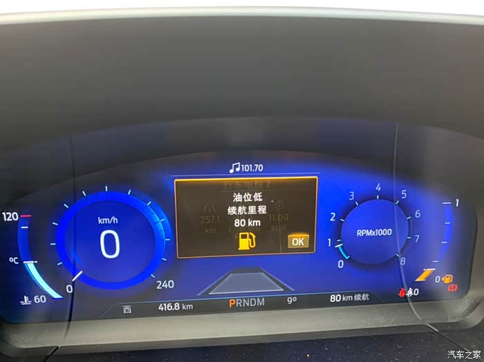 下午1点多,油表告警。锐际的油表是剩余续航80公里就告警了,以前福克斯都是剩余60才亮灯告警。另一个有意思的地方是,锐际油表告警会在仪表盘和中控屏上都显示,而且还会用语音提醒你。
