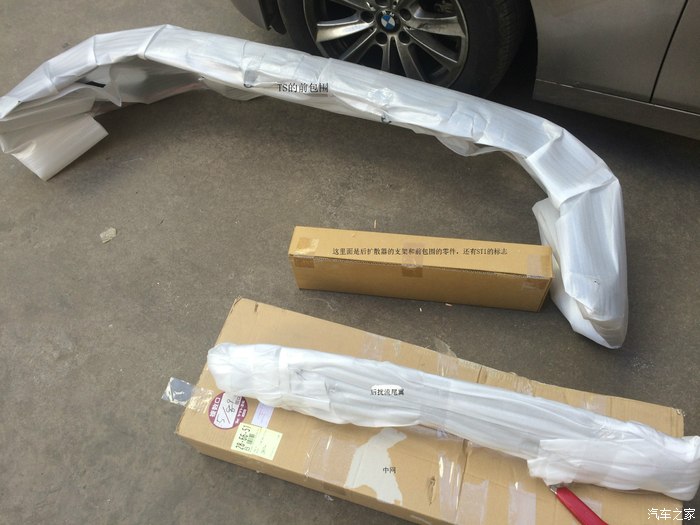 拆开以后有四个部分:包括前包围、后扰流板,中网、后扰流的配件盒子。