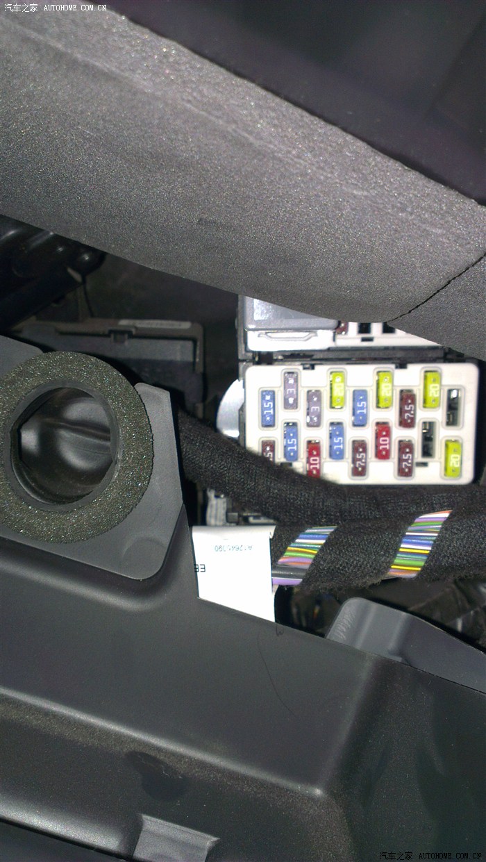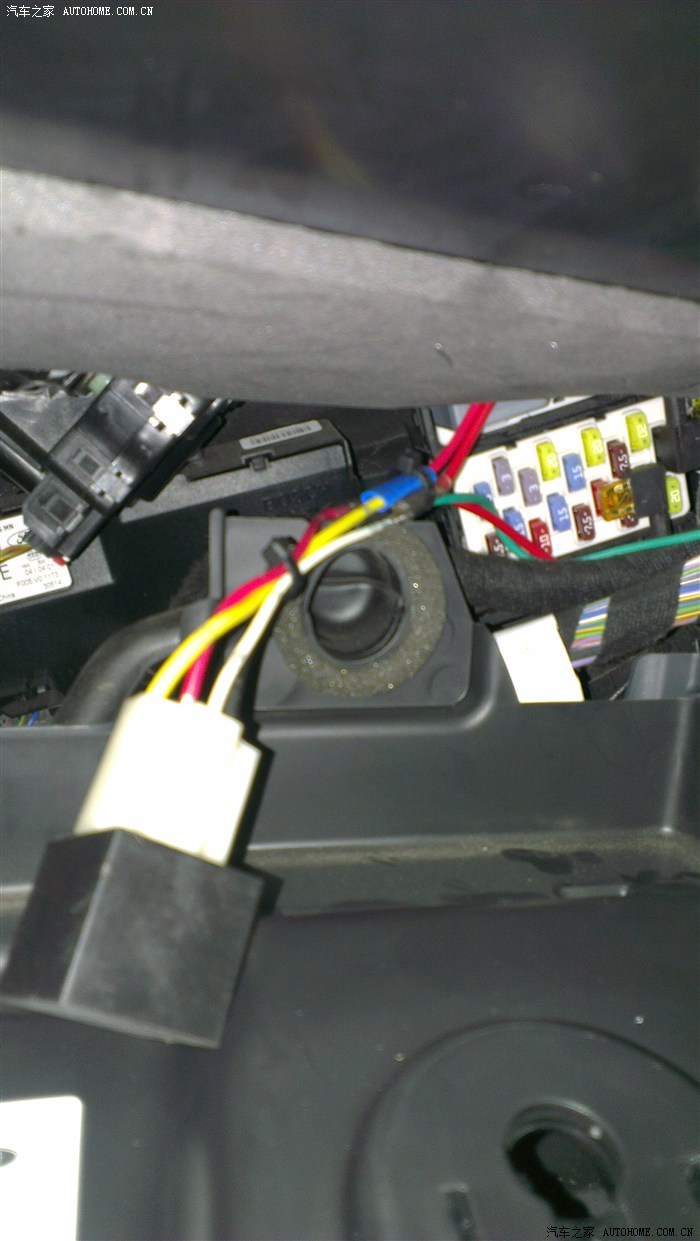 追加认识,可能对后面的朋友有所帮助。按照上面的方法改进后确实解决了漏电问题,但是还有一个更加完美的解决方法,大多数导航都有两个供电输入,(我的这个就是)一个是全供电输入,另外一个是存储器供电输入,(翼博车只给了一个全供电输入线)。所以停车断电后,只是屏幕断电,功放等部分造常供电。这就是漏电的根本原因。解决办法:加一条线,接在dvd导航的存储器供电口上,另一端接在上面图的(手套箱后面的保险丝盒)右面那个保险丝上面。然后将全供电的那条线接到左面那个保险丝(偏下的那个)的出线端。就完美解决了漏电问题。此举的优点,不用继电器。就是加一条线和一个保险丝而已。祝朋友们马年快乐。