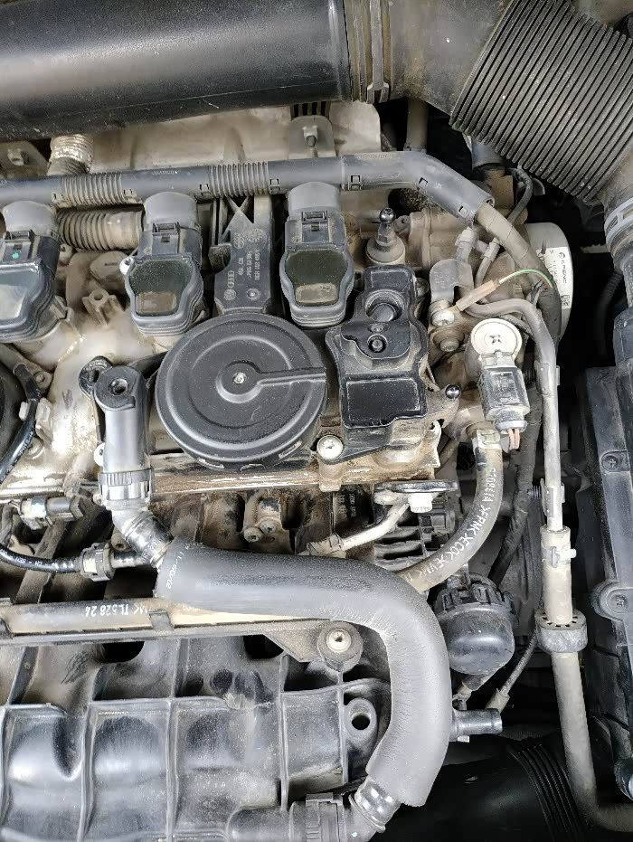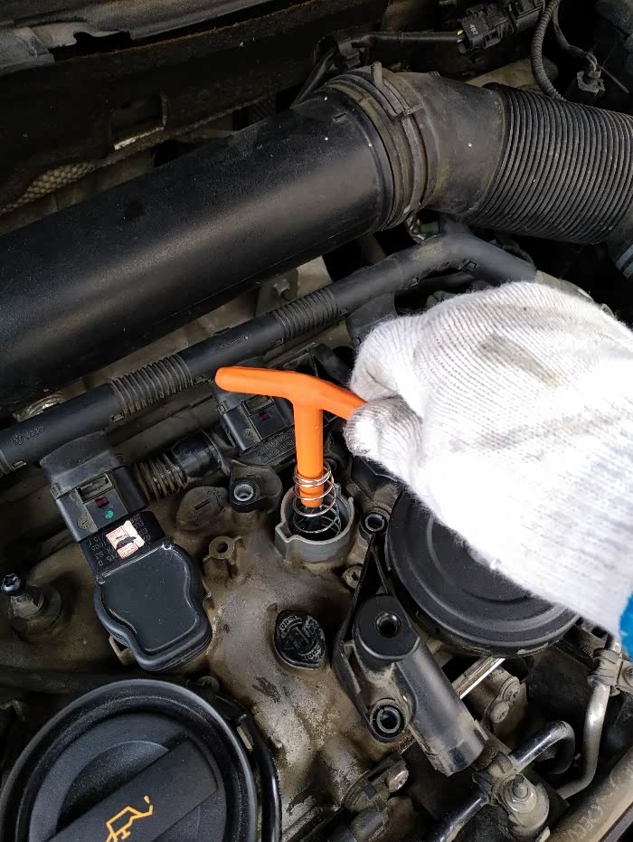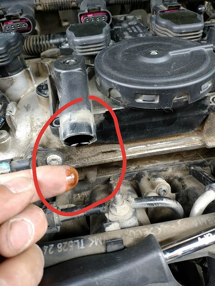 4.拆掉原来的油气分离器,松开螺丝,有10颗。拔掉空气管的时候发现里面有机油,怀疑机油在这里浪费掉好多,下面图片我会指出。安装新的完成后回差点火线圈。启动试车,发现怠速不斗动了,等红绿灯时候也不抖了。哈哈,希望不烧机油了,等开半个月后在查看机油尺,目前我已添加了机油,并机油尺拍照。