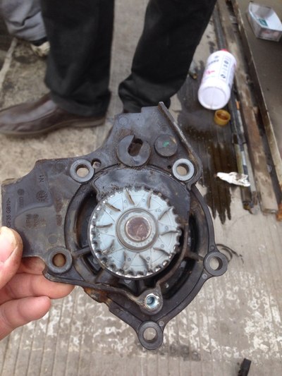 前几天才发得帖子,3天漏光防冻液。今天上午去检查,说水泵头坏了。换得半总成。用了一上午时间,9点左右一直到将近1点。只换的半总成。就是这个地方轴承水封磨损严重漏水。很麻烦,需要把进气歧管拆了才能看到水泵。