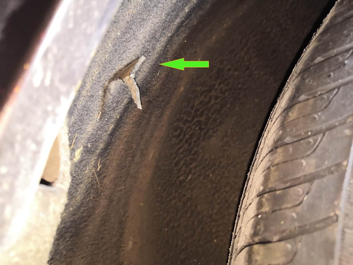 轮胎取下来没发现哪里有异物,第二天才在挡泥衬上发现了罪魁祸首。