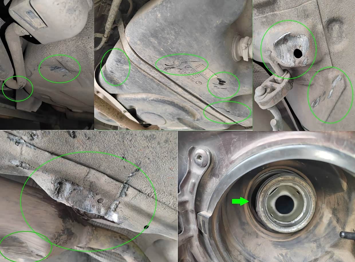 帝豪一直被我当越野车在开,底盘早已是伤痕累累。护板变形不说,油底壳都瘪了点。最惨的就是上图了,第二次去黑竹沟玩,60的速度,懒得打方向,骑了个落石,以为底盘够高没问题。结果石头正好挂到最低处的护板螺丝,把车都撞跳起来了。回来上举升机检查,发现护板螺丝歪了,中消吊耳座和附近受伤,中消打瘪,旁边底盘件撕裂,碳罐蒸汽管刮到,备胎舱凹上去一个拳头,把备胎都顶起来了。最吓人的是油箱,5处擦痕!整个油箱后坐了1厘米,修理厂想了很多办法都没能复位。荒山野岭,还好油箱没有破,帝豪又把我安全地带回来了。