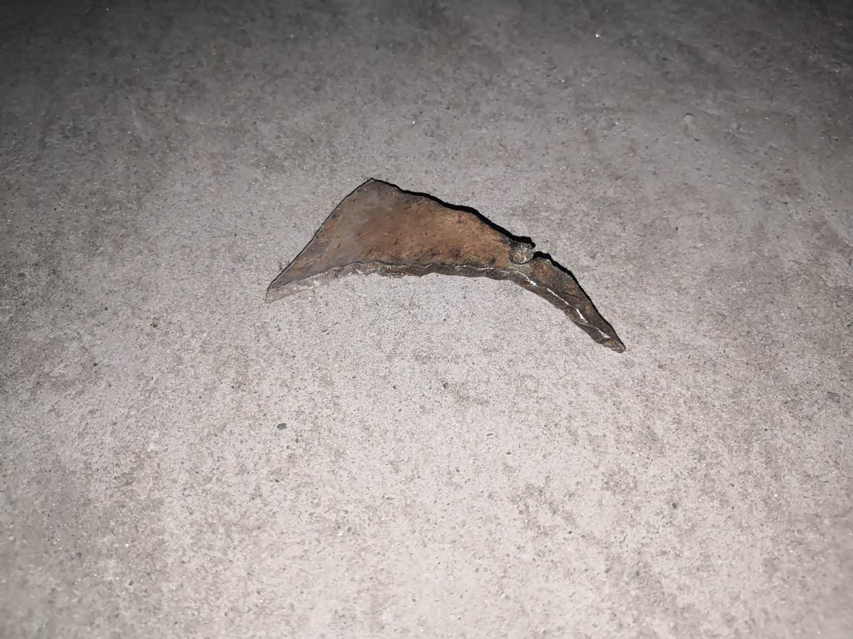 当时应该是前轮压到,然后嘭的一声甩到后轮上,扎破轮胎后又被甩来插破挡泥衬板。要是甩出去扎到人……