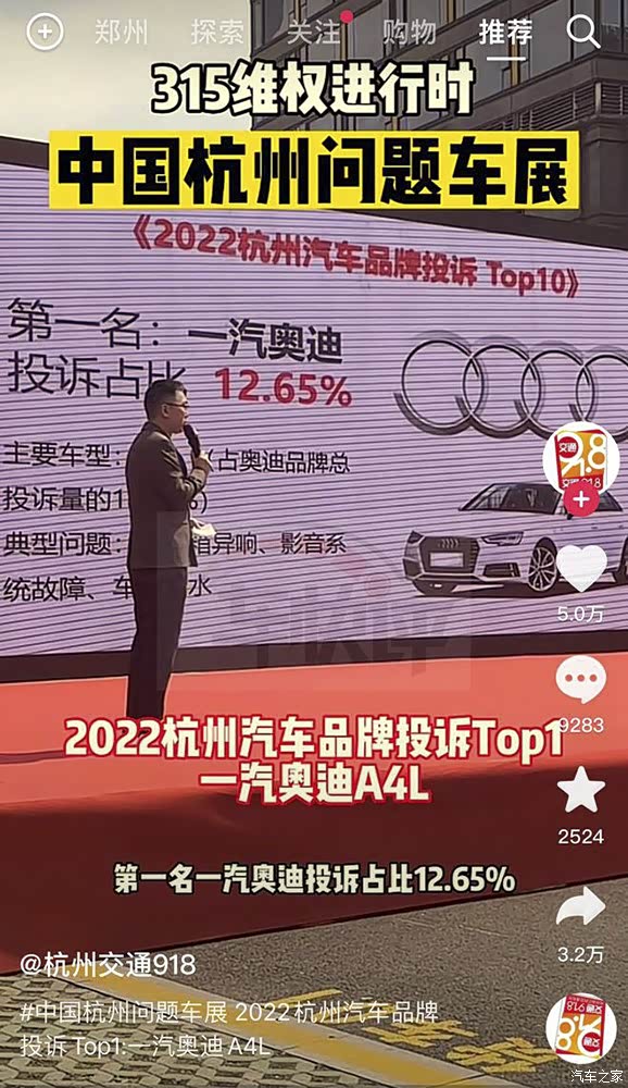 据第三方投诉平台车质网数据显示,仅今年1月1日至3月21日,关于一汽奥迪的各类投诉就多达275起,并涉及了一汽奥迪目前在产的所有车型,包括新能源车。其中,对质量问题的投诉约占总投诉量的三分之二以上。而在今年的第十二届(杭州)问题车展上,一汽奥迪更是以12.65%的投诉占比成为汽车品牌投诉的第一名。