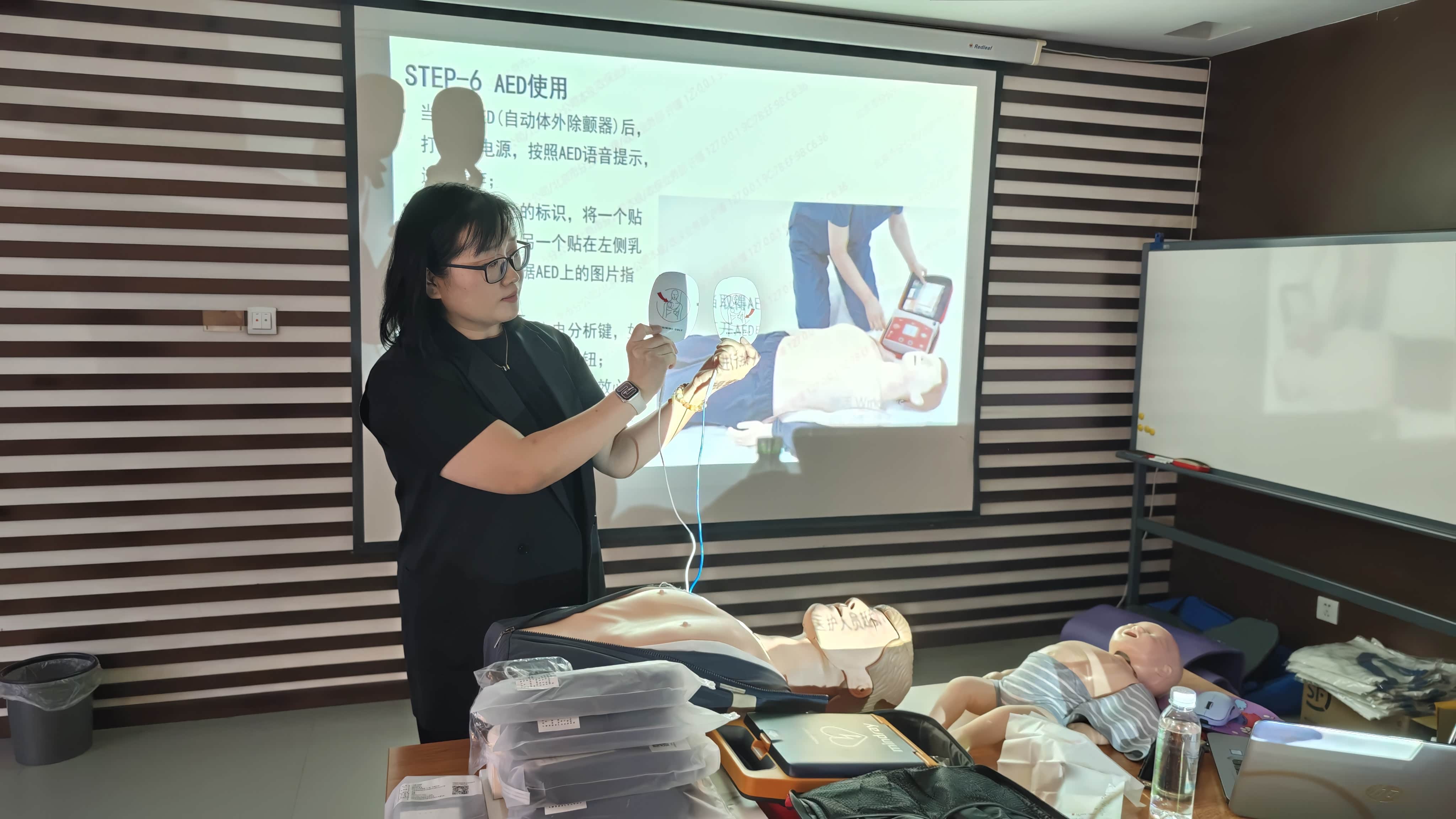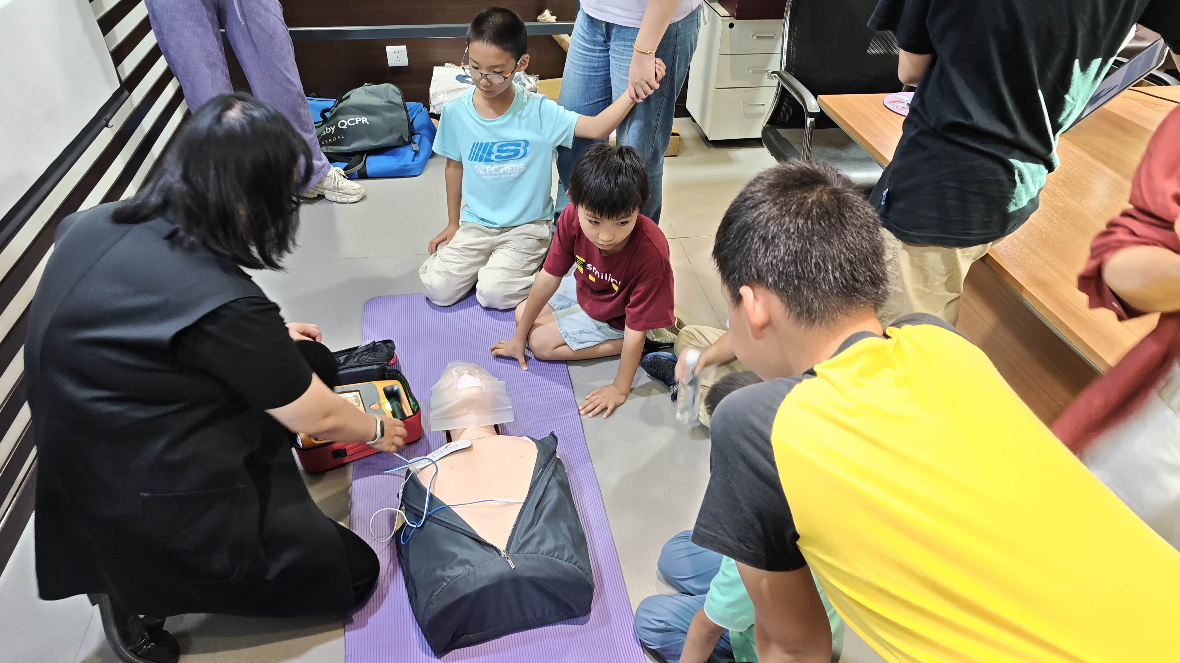 ? 活动伊始,便是紧张而充实的急救知识培训及实操环节 ,这也是本次活动的核心部分。专业的急救培训师受邀而来,带着丰富的专业知识和实际救援经验,为我们开启了这堂生命的必修课。?培训师首先为我们详细讲解了心肺复苏(CPR)的关键要点 。从判断患者意识和呼吸的方法,到胸外按压的正确位置、深度和频率,再到人工呼吸的操作技巧,每一个细节都讲解得清晰明了。“大家注意,胸外按压的位置在两乳头连线中点,也就是胸骨中下 1/3 交界处 ,按压频率要保持在每分钟 100 - 120 次,深度至少 5 厘米 ,但也不能超过 6 厘米,按压和放松的时间要大致相等 ,而且每次按压都要保证胸廓充分回弹 。” 培训师一边讲解,一边在模拟人上进行标准示范 ,动作娴熟而有力,让我们深刻认识到心肺复苏的重要性和严谨性。?接着,培训师拿出了本次培训的 “主角”—— 自动体外除颤器(AED) ,并详细介绍了它的使用方法 。“AED,也叫自动体外除颤器,是一种便携式的医疗设备 ,它可以诊断特定的心律失常 ,并给予电击除颤 ,是抢救心脏骤停患者的重要工具 。大家看,使用 AED 时,首先要打开设备,按照语音提示操作 ,将电极片正确贴在患者胸部 ,然后让 AED 分析心律 ,如果它提示需要除颤 ,在确保周围人员安全的情况下 ,按下放电按钮就可以了 。” 培训师的讲解通俗易懂 ,让原本看似复杂的 AED 使用方法变得简单易懂 。?在理论讲解之后,便是紧张刺激的实操环节 。孩子们排队在培训师的指导下逐一进行实践操作,在培训师的耐心指导和鼓励下 ,孩子们逐渐找到了感觉 ,动作也越来越熟练 。“对,就是这样,继续保持 ,注意按压的节奏和力度 。” 培训师在一旁不断地给予肯定和建议 ,让孩子们信心倍增 。?经过一番努力,孩子们每个人都基本掌握了心肺复苏和 AED 的使用方法 ,得到了培训师的肯定 。那一刻,孩子们的脸上都洋溢着自豪的笑容 ,他们已经掌握了一项可以挽救生命的重要技能 。