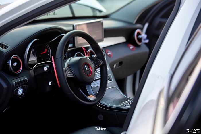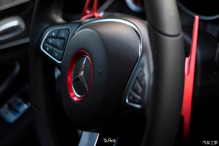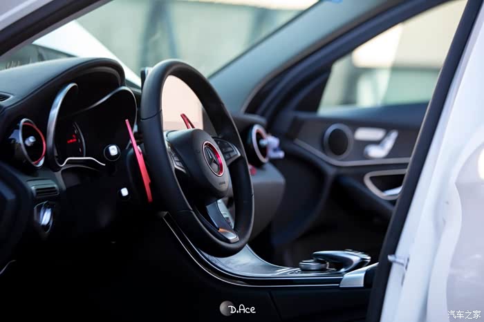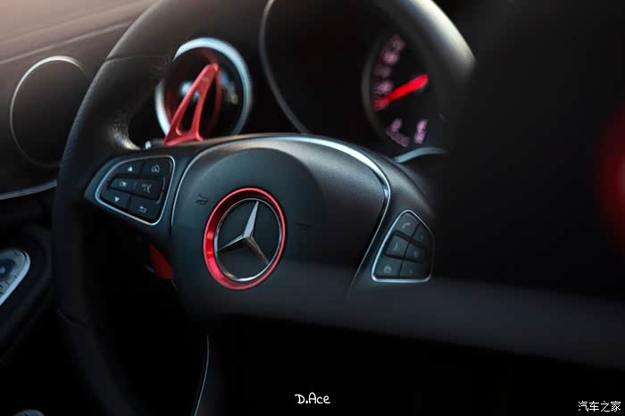 传统的多功能三辐方向盘,中间镶嵌奔驰的LOGO,红色的金属饰条点缀在空调出风口、方向盘中间、换挡拨片上,用最热烈的颜色宣告自己的年龄与激情。
