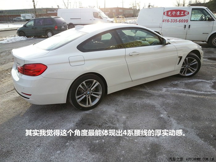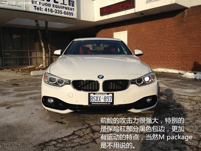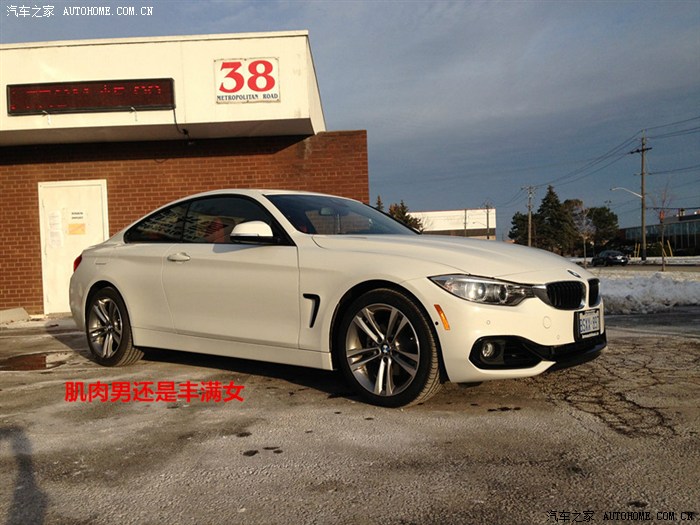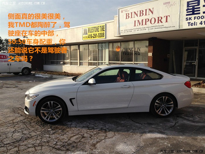 小弟不才,人在加拿大多伦多做点小买卖,女朋友上学不是很方便,所以需要增加一辆车。和所以网友一样,开始网上,路上,电视,4S店寻找自己的玩具。说实话开头没有打算买BMW的,原因很简单太多了,朋友圈子里有不下10多辆BMW,还是想买破鞋的Panamara的,可是利率有点高,明显是坑我们这些没有身份的外国人~~~后来就打算直接现金买断,省的麻烦,所以档次就降低了点。当时就打算MB和BMW选择,因为我们两个都不喜欢ADUI,MB的C要换代了,E350 Coupe倒是刚上,去看了也很漂亮,价格一问8W有点小贵,而且是穿着E外壳的小C,有点不高兴。还是3系吧,我们都这么说,价格也不错,优惠15个点,这都打算订的时候,突然看到4系在美国上市了,去4S一打听,接受预定,当时是9月初,全部下来是61800刀加币,折RMB36W。11月26号提车,第三天出差,来回1000KM,总体来说加速特别快,噪音也控制的很好,底盘悬挂扎实,操控有信心,这是我开过开的最舒服的车了。如果家里有轿车和越野车的,打算购入第二辆车的话,我首推荐4系。下面进入全图模式。。。。。ENJOY