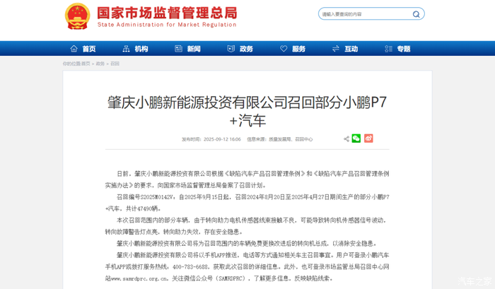 9月12日,国家市场监督管理总局发布消息称,自2025年9月15日起,召回2024年8月20日至2025年4月27日期间生产的部分小鹏P7+汽车,共计47490辆。