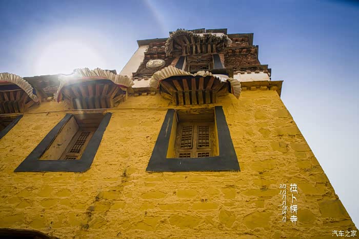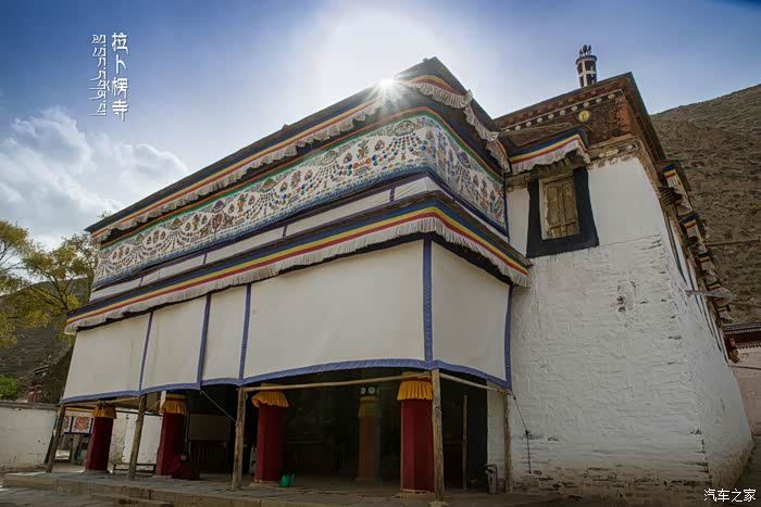 抬眼望去,大经堂采用藏汉结合的建筑风格,汉时建筑风格的飞檐走壁,以红黄蓝为主的艳丽色彩,为典型的藏式建筑特点。蓝天白云下,壮观而又肃穆,非常震撼!