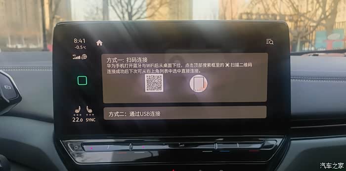 首选无线连接,此时需要用华为手机相机中的扫一扫,扫描车机端的二维码进行手车互联。配对成功后,华为HICAR手机界面就会自动同步到车机端。