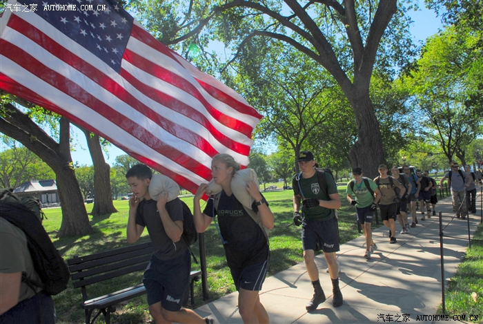 一队美国年轻人,扛着沙袋练跑步。